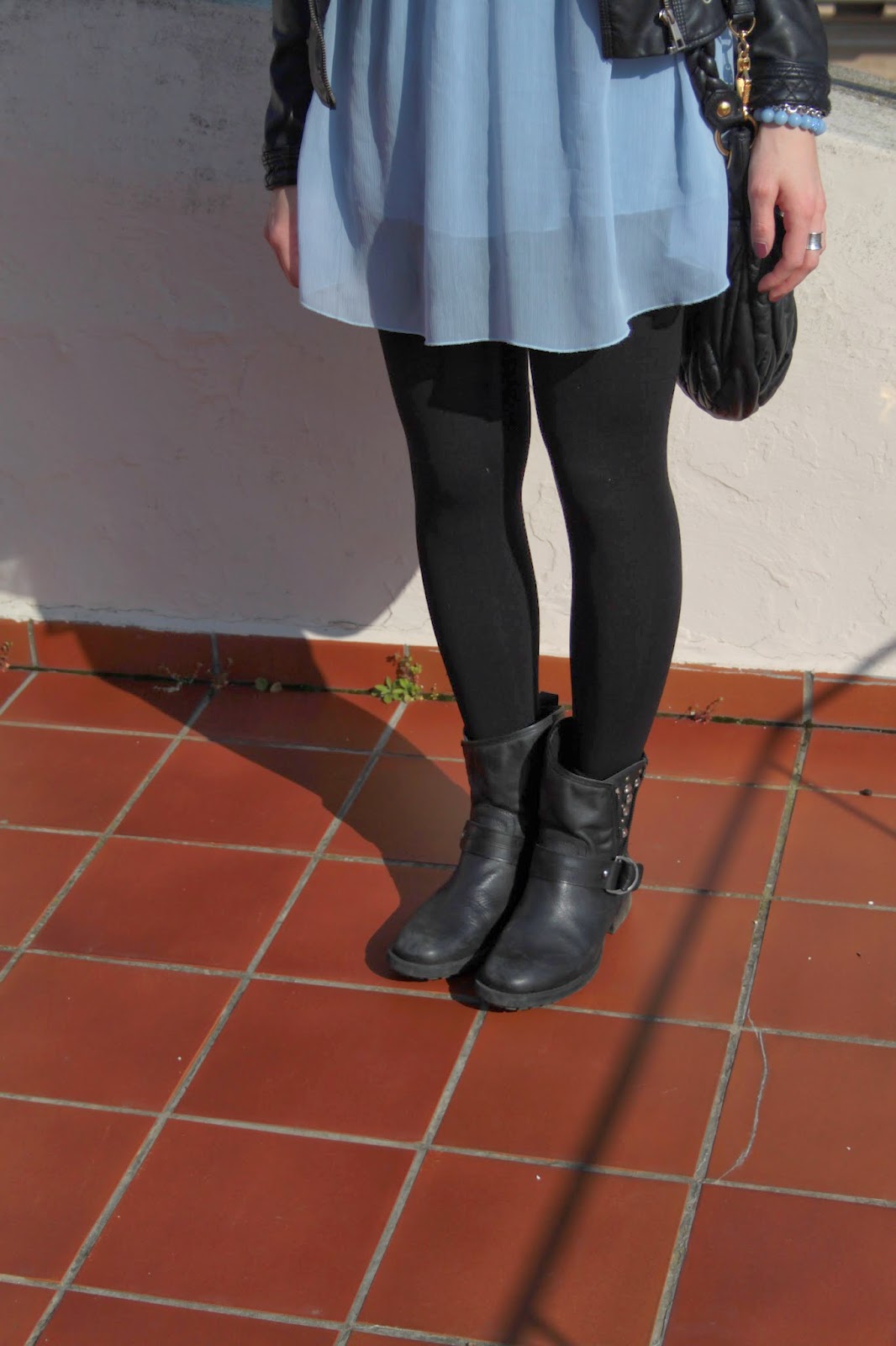 Azzurro come il cielo e fresco come una brezza marina... così descriverei questo vestito. Lo indosso d'estate, d'inverno, in primavera e in autunno, insomma, sempre! Lo adoro indossato con il giubbino nero di ecopelle e con i biker boots per donargli un pò di carattere.